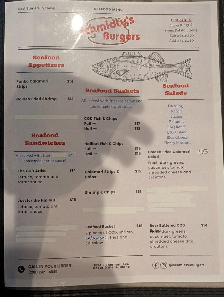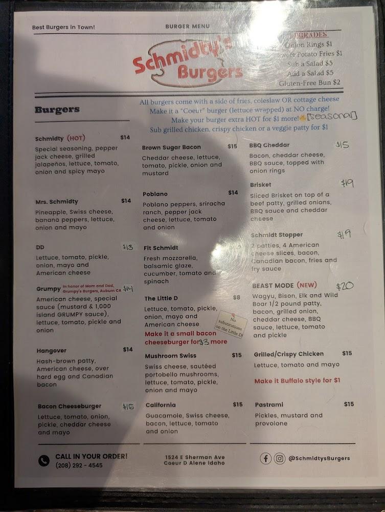 Welcome to Schmidty's Burgers, your go-to destination in Coeur d'Alene for delicious handcrafted burgers and local specialties! Located at 1524 E Sherman Ave, we pride ourselves on our fast service and laid-back atmosphere, perfect for a quick lunch or a relaxing dinner. Enjoy a diverse menu featuring burgers, fries, and mouth-watering desserts, complemented by a selection of beers and wines. We offer convenient amenities like delivery, takeout, and accessible seating. Whether you’re a student, tourist, or just out for a casual meal, Schmidty's Burgers promises a satisfying experience for everyone. Come for the food, stay for the vibes!